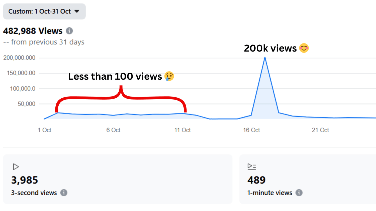 Nung una less than 100 views lang ang videos namin pero hindi kami sumuko until one day around Oct 17 nag spike to 200k views ang isang video namin and nag earn yun ng around $0.57 usd. So naisip namin if gawin namin yung same video nayun that triggered the views ang i-upload daily, kaso hassle ang magshoot araw-araw at magpakita ng face sa social media dun namin naisipan gumawa ng AI videos.